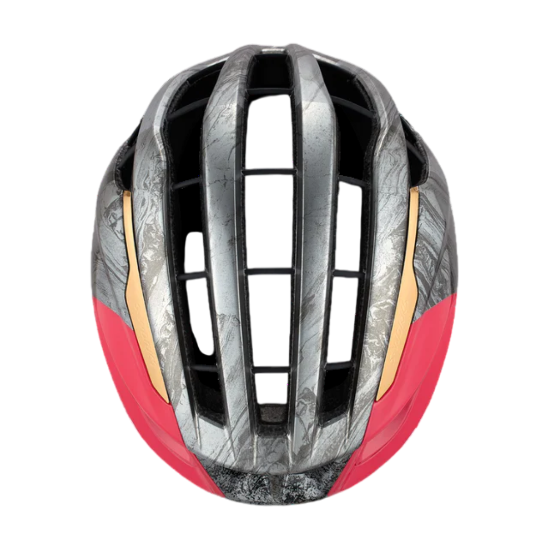 Cuando un casco recibe un impacto, su función es disipar la energía del impacto. El enfoque tradicional en el diseño de cascos es que más espuma (EPS) significa una mejor gestión de la energía. Reescrito el libro sobre el diseño de cascos de ciclismo al innovar más allá de la espuma. Los “cables” de aramida tejida atraviesan el casco y están anclados a los paneles laterales de fibra de carbono. En caso de impacto, la tecnología AirCage* funciona como un puente colgante y está diseñada para distribuir fuerzas localizadas en todo el casco.